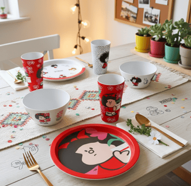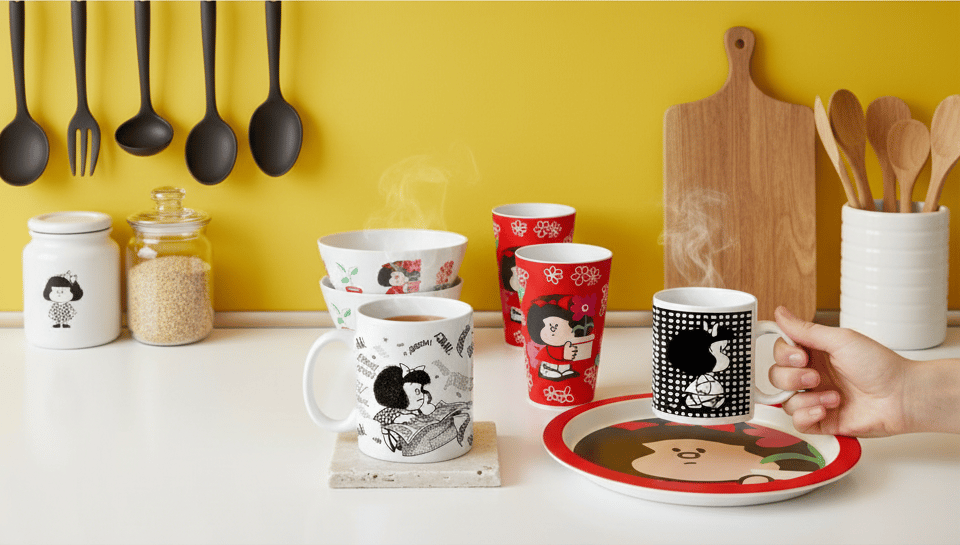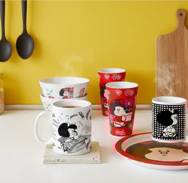 Delantales, manoplas, tazas y vajilla con diseños de Mafalda.